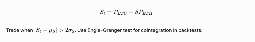 Cointegrated pairs (e.g., BTC-ETH perpetuals). Spread: