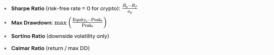 Simulate realistic slippage (0.05–0.20% on majors), funding rates on perps, and API latency. Target: Sharpe > 1.8 and max DD < 15% on 3+ years of tick data.